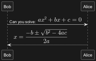 Alice --> Bob: <math>x = (-b+-sqrt(b^2-4ac))/(2a)</math>