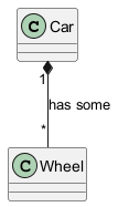 Car "1" *-- "*" Wheel : [[http://plantuml.com/class-diagram has some]]