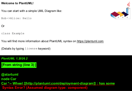 Car *-- Wheel [[http://plantuml.com/deployment-diagram]] : has some