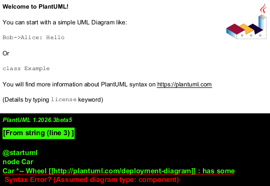 Car *-- Wheel [[http://plantuml.com/deployment-diagram]] : has some
