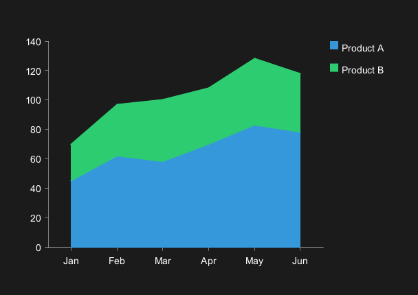 Area charts are similar to line charts but with filled regions: