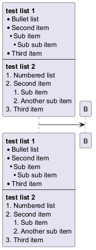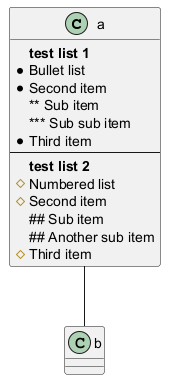 state "**test list 1**\n* Bullet list\n* Second item\n** Sub item\n*** Sub sub item\n* Third item\n----\n**test list 2**\n# Numbered list\n# Second item\n## Sub item\n## Another sub item\n# Third item" as b