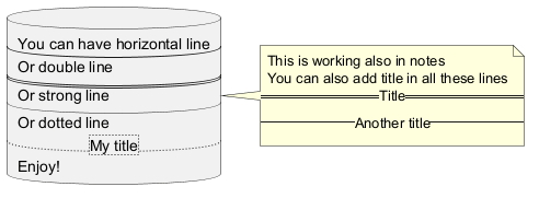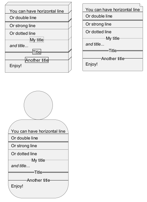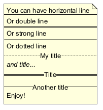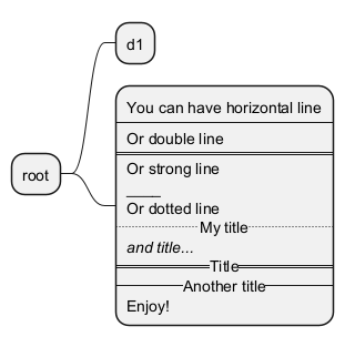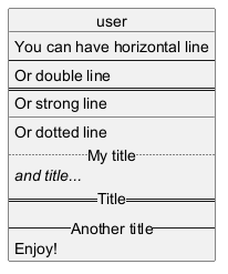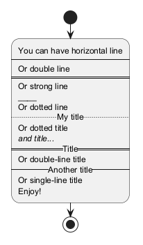 state "You can have horizontal line\n----\nOr double line\n====\nOr strong line\n____\nOr dotted line\n..My title..\n//and title... //\n==Title==\n--Another title--\nEnjoy!" as a {