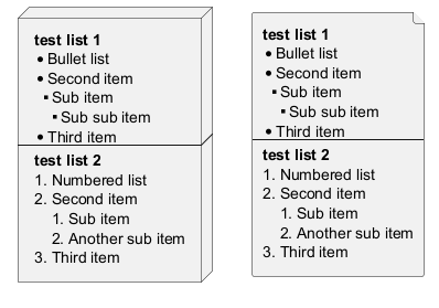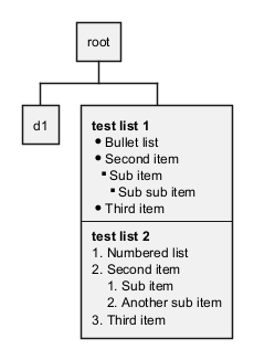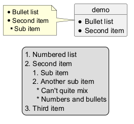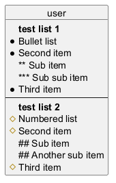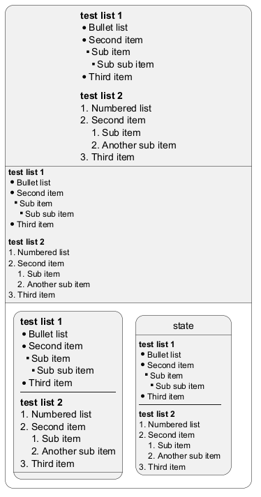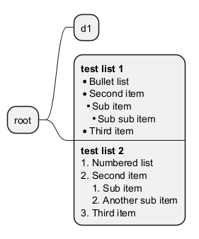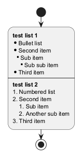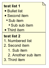 state "**test list 1**\n* Bullet list\n* Second item\n** Sub item\n*** Sub sub item\n* Third item\n----\n**test list 2**\n# Numbered list\n# Second item\n## Sub item\n## Another sub item\n# Third item" as a {