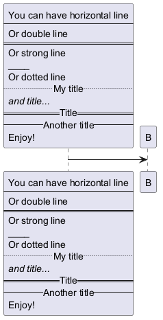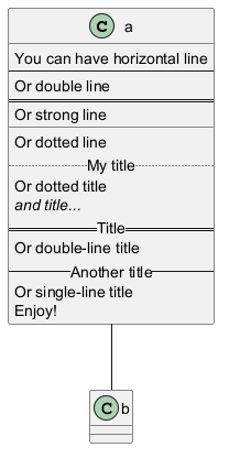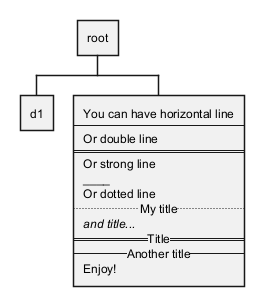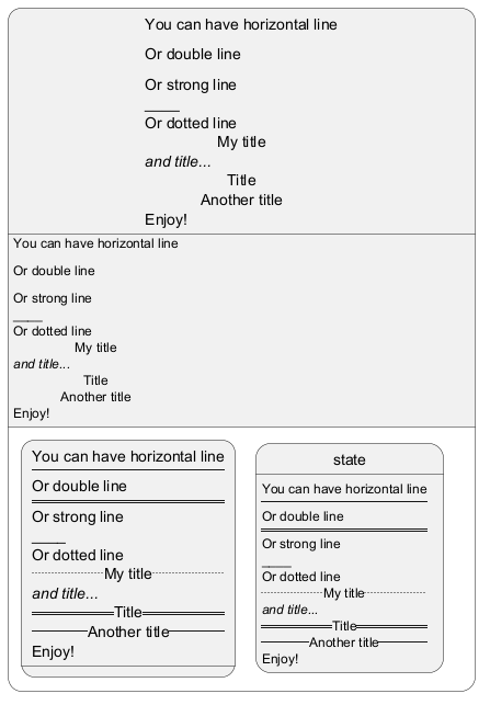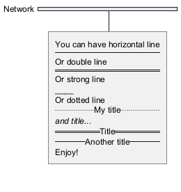 state "You can have horizontal line\n----\nOr double line\n====\nOr strong line\n____\nOr dotted line\n..My title..\n//and title... //\n==Title==\n--Another title--\nEnjoy!" as b