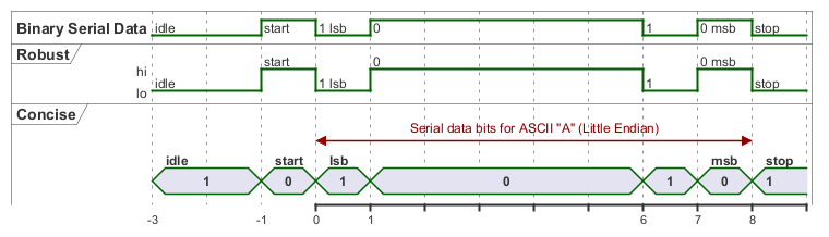 @0 <-> @8 : Serial data bits for ASCII "A" (Little Endian)