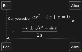 Alice --> Bob: <math>x = (-b+-sqrt(b^2-4ac))/(2a)</math>