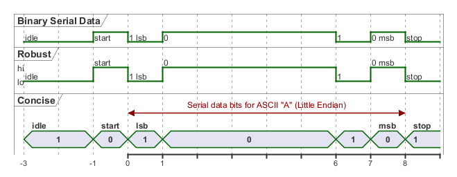 @0 <-> @8 : Serial data bits for ASCII "A" (Little Endian)