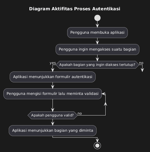 @startuml title Diagram Aktifitas Proses Autentikasi start :Pengguna membuka aplikasi; :Pengguna ingin mengakses suatu bagian; if (Apakah bagian yang ingin diakses tertutup?) then (yes) :Aplikasi menunjukkan formulir autentikasi; repeat :Pengguna mengisi formulir lalu meminta validasi; repeat while (Apakah pengguna valid?) is (no) ->yes; label show :Aplikasi menunjukkan bagian yang diminta; else (no) goto show endif stop @enduml