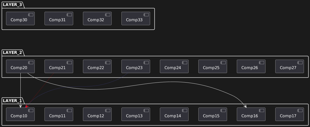 @startuml package LAYER_3 { component Comp30 { } component Comp31 { } component Comp32 { } component Comp33 { } } package LAYER_2 { component Comp20 { } component Comp21 { } component Comp22 { } component Comp23 { } component Comp24 { } component Comp25 { } component Comp26 { } component Comp27 { } } package LAYER_1 { component Comp10 { } component Comp11 { } component Comp12 { } component Comp13 { } component Comp14 { } component Comp15 { } component Comp16 { } component Comp17 { } } ' Hidden connections ' ------------------ ' Use hidden right connections to encourage the components ' within each layer to be placed in the desired order. Comp30 -[hidden]r- Comp31 Comp31 -[hidden]r- Comp32 Comp32 -[hidden]r- Comp33 Comp20 -[hidden]r- Comp21 Comp21 -[hidden]r- Comp22 Comp22 -[hidden]r- Comp23 Comp23 -[hidden]r- Comp24 Comp24 -[hidden]r- Comp25 Comp25 -[hidden]r- Comp26 Comp26 -[hidden]r- Comp27 Comp10 -[hidden]r- Comp11 Comp11 -[hidden]r- Comp12 Comp12 -[hidden]r- Comp13 Comp13 -[hidden]r- Comp14 Comp14 -[hidden]r- Comp15 Comp15 -[hidden]r- Comp16 Comp16 -[hidden]r- Comp17 ' Use hidden down connections between the first component in each ' layer to encourage all the layers to be left-aligned. ' NOTE: Use longer arrows to force more space between the layers, so ' that the visible arrows can be more clearly distinguished. ' NOTE: Since we later create a *visible* connection from Comp20 to ' Comp10, we omit create a hidden connection here, otherwise the ' visible connection ends up curving to avoid the hidden one. Comp30 -[hidden]d-- Comp20 'Comp20 -[hidden]d-- Comp10 ' Visible connections ' ------------------- ' NOTE: Use norank to prevent these visible connections from taking ' prescedence over the hidden connections and breaking the layout, ' *except* for the visible connections which are equivalent to the ' hidden connections that we have omitted. Comp23 -[norank,#6666ff,dotted]-> Comp10 Comp21 -[norank,dotted,#red]-> Comp10 Comp20 -d--> Comp10 Comp20 -[norank]-> Comp16 @enduml