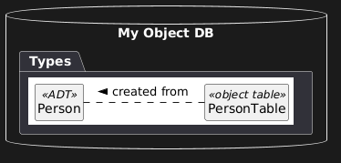 @startuml database "My Object DB" as n { package Types [ {{ hide circles hide empty fields hide empty methods class Person <<ADT>> class PersonTable <<object table>> PersonTable .l. Person : created from > }} ] } @enduml