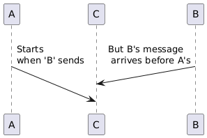 @startuml !pragma teoz true A ->(50) C: Starts\nwhen 'B' sends & B ->(25) C: \nBut B's message\n arrives before A's @enduml