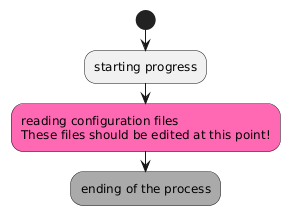 @startuml start :starting progress; #HotPink:reading configuration files These files should be edited at this point!; #AAAAAA:ending of the process; @enduml