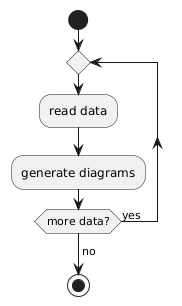 @startuml start repeat :read data; :generate diagrams; repeat while (more data?) is (yes) ->no; stop @enduml