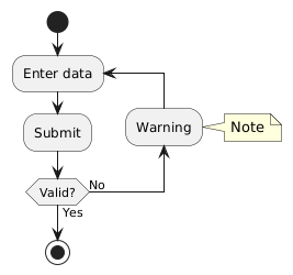 @startuml start repeat :Enter data; :Submit; backward :Warning; note right: Note repeat while (Valid?) is (No) not (Yes) stop @enduml