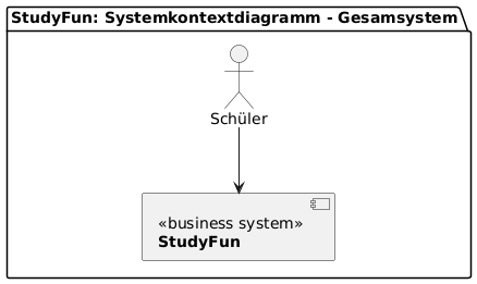 @startuml allowmixing package "StudyFun: Systemkontextdiagramm - Gesamsystem" { component comp1 [ <<business system>> <b>StudyFun</b>] actor Schüler Schüler --> comp1 } @enduml