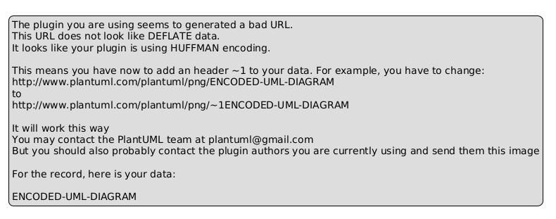 @startuml legend The plugin you are using seems to generated a bad URL. This URL does not look like DEFLATE data. It looks like your plugin is using HUFFMAN encoding. This means you have now to add an header ~1 to your data. For example, you have to change: http://www.plantuml.com/plantuml/png/ENCODED-UML-DIAGRAM to http://www.plantuml.com/plantuml/png/~1ENCODED-UML-DIAGRAM It will work this way You may contact the PlantUML team at plantuml@gmail.com But you should also probably contact the plugin authors you are currently using and send them this image For the record, here is your data: ENCODED-UML-DIAGRAM endlegend @enduml