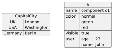 @startuml map CapitalCity { UK => London USA => Washington Germany => Berlin } json A { "name": "component c1", "color": ["normal", "green", "red"], "visible": true, "user" : { "age": 23, "name": "John"} } @enduml