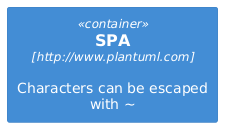 @startuml !include <C4/C4_Container.puml> Container(spa, "SPA", "http:~/~/www.plantuml.com", "Characters can be escaped with ~") @enduml