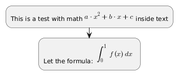 @startuml :This is a test with math<latex>\scalebox{.7} {\displaystyle{a}\cdot{x}^{2}+{b}\cdot{x}+{c}}</latex>inside text; :Let the formula: <latex>\scriptsize {{ \int_{{0}}^{{1}}} f{{\left({x}\right)}}{\left.{d}{x}\right.}}</latex>; @enduml