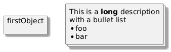 @startuml allowmixing skinparam shadowing true object firstObject collections collection [ This is a **long** description with a bullet list * foo * bar ] @enduml