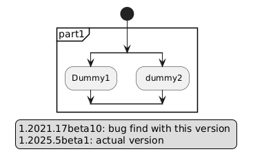 @startuml start partition part1{ split :Dummy1; split again : dummy2; endsplit } legend 1.2021.17beta10: bug find with this version %version(): actual version end legend @enduml