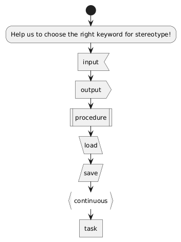 @startuml start :Help us to choose the right keyword for stereotype!; :input; <<input>> :output; <<output>> :procedure; <<procedure>> :load; <<load>> :save; <<save>> :continuous; <<continuous>> :task; <<task>> @enduml