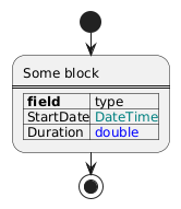 @startuml !DateTime="<color:teal>DateTime" !double="<color:blue>double" start :Some block ==== |= field| type| | StartDate| DateTime| | Duration| double|; stop @enduml