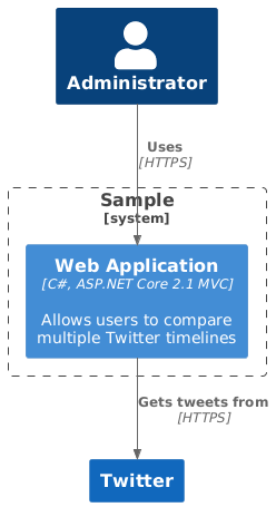 @startuml !include https://raw.githubusercontent.com/plantuml-stdlib/C4-PlantUML/master/C4_Container.puml HIDE_STEREOTYPE() Person(admin, "Administrator") System_Boundary(c1, 'Sample') { Container(web_app, "Web Application", "C#, ASP.NET Core 2.1 MVC", "Allows users to compare multiple Twitter timelines") } System(twitter, "Twitter") Rel(admin, web_app, "Uses", "HTTPS") Rel(web_app, twitter, "Gets tweets from", "HTTPS") @enduml