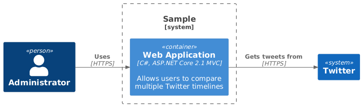 @startuml !include https://raw.githubusercontent.com/plantuml-stdlib/C4-PlantUML/master/C4_Container.puml LAYOUT_LEFT_RIGHT() Person(admin, "Administrator") System_Boundary(c1, 'Sample') { Container(web_app, "Web Application", "C#, ASP.NET Core 2.1 MVC", "Allows users to compare multiple Twitter timelines") } System(twitter, "Twitter") Rel(admin, web_app, "Uses", "HTTPS") Rel(web_app, twitter, "Gets tweets from", "HTTPS") @enduml