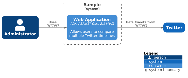 @startuml ' activates new style. It has to be set before a theme or a C4_* file is included !ROUNDED_STYLE=1 !include https://raw.githubusercontent.com/plantuml-stdlib/C4-PlantUML/v2.13.0/C4_Container.puml LAYOUT_LANDSCAPE() Person(admin, "Administrator") System_Boundary(c1, 'Sample') { Container(web_app, "Web Application", "C#, ASP.NET Core 2.1 MVC", "Allows users to compare multiple Twitter timelines") } System(twitter, "Twitter") Rel(admin, web_app, "Uses", "HTTPS") Rel(web_app, twitter, "Gets tweets from", "HTTPS") SHOW_LEGEND() @enduml