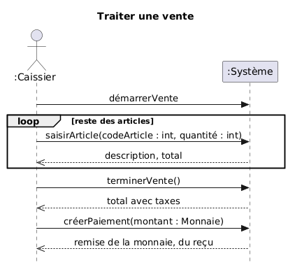 @startuml skinparam style strictuml skinparam defaultFontName Helvetica,Arial,sans-serif skinparam backgroundcolor transparent skinparam SequenceMessageAlign center title Traiter une vente actor ":Caissier" as c participant ":Système" as s c->s : démarrerVente loop reste des articles c->s : saisirArticle(codeArticle : int, quantité : int) c<<--s : description, total end loop c->s : terminerVente() c<<--s : total avec taxes c->s : créerPaiement(montant : Monnaie) c<<--s : remise de la monnaie, du reçu @enduml