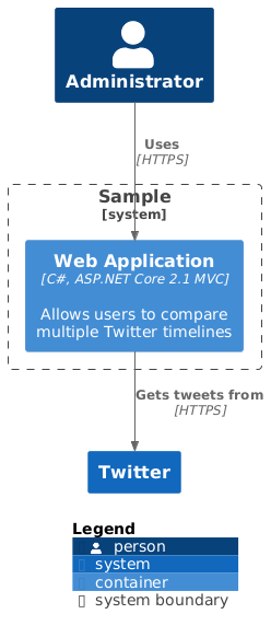 @startuml !include https://raw.githubusercontent.com/plantuml-stdlib/C4-PlantUML/master/C4_Container.puml Person(admin, "Administrator") System_Boundary(c1, 'Sample') { Container(web_app, "Web Application", "C#, ASP.NET Core 2.1 MVC", "Allows users to compare multiple Twitter timelines") } System(twitter, "Twitter") Rel(admin, web_app, "Uses", "HTTPS") Rel(web_app, twitter, "Gets tweets from", "HTTPS") SHOW_LEGEND() @enduml