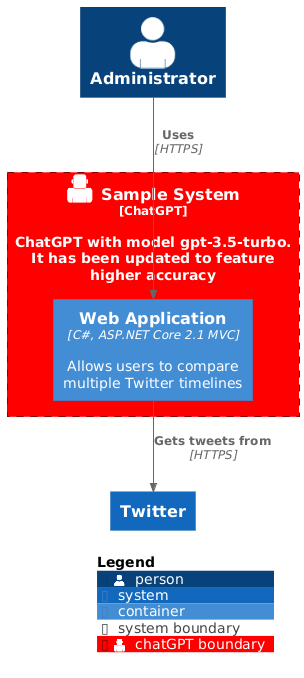 @startuml !include https://raw.githubusercontent.com/kirchsth/C4-PlantUML/extended/C4_Container.puml AddBoundaryTag("chatGPT", $type="ChatGPT", $bgColor="red", $fontColor="white", $borderColor="darkred", $sprite="robot2") Person(admin, "Administrator",$sprite="person2") System_Boundary(c1, "Sample System", $descr="ChatGPT with model gpt-3.5-turbo. It has been updated to feature higher accuracy", $tags="chatGPT") { Container(web_app, "Web Application", "C#, ASP.NET Core 2.1 MVC", "Allows users to compare multiple Twitter timelines") } System(twitter, "Twitter") Rel(admin, web_app, "Uses", "HTTPS") Rel(web_app, twitter, "Gets tweets from", "HTTPS") SHOW_LEGEND() @enduml