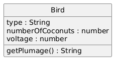 @startuml skinparam style strictuml skinparam defaultFontName Helvetica,Arial,sans-serif skinparam backgroundcolor transparent class Bird { type : String numberOfCoconuts : number voltage : number getPlumage() : String } @enduml