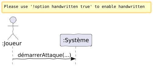 @startuml skinparam style strictuml skinparam backgroundcolor transparent skinparam defaultfontname xkcd Script skinparam handwritten true scale 1.3 skinparam sequenceMessageAlign center actor ":Joueur" as c participant ":Système" as s c->s : démarrerAttaque(...) @enduml
