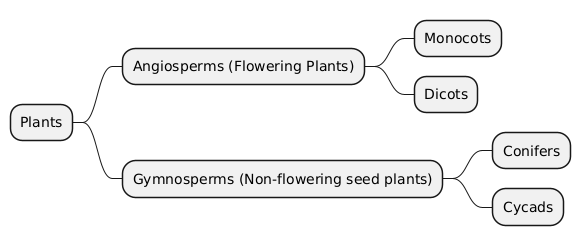 @startmindmap + Plants ++ Angiosperms (Flowering Plants) +++ Monocots +++ Dicots ++ Gymnosperms (Non-flowering seed plants) +++ Conifers +++ Cycads @endmindmap