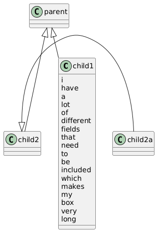 @startuml together { class child1 { i have a lot of different fields that need to be included which makes my box very long } class child2 } child2 <|- child2a parent <|-- child1 parent <|- child2 @enduml