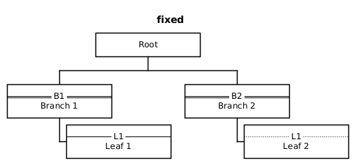 @startwbs title fixed !procedure $s() <style> wbsDiagram { LineColor Black BackgroundColor White node { HorizontalAlignment center Margin 10 MinimumWidth 150 } } </style> !endprocedure $s() + Root ++ == B1 ==\nBranch 1 +++ -- L1 --\nLeaf 1 ++ == B2 ==\nBranch 2 +++ .. L1 ..\nLeaf 2 @endwbs