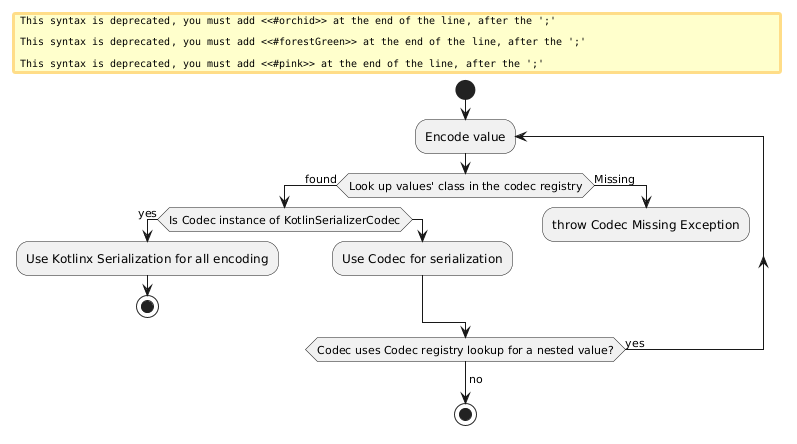 @startuml !pragma useVerticalIf on start repeat :Encode value; if (Look up values' class in the codec registry) then (found) if (Is Codec instance of KotlinSerializerCodec) then (yes) #orchid:Use Kotlinx Serialization for all encoding; stop else #forestGreen:Use Codec for serialization; endif else (Missing) #pink:throw Codec Missing Exception; kill endif repeat while (Codec uses Codec registry lookup for a nested value?) is (yes) ->no; stop @enduml