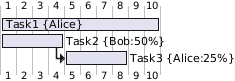 @startgantt hide ressources footbox [Task1] on {Alice} lasts 10 days [Task2] on {Bob:50%} lasts 2 days then [Task3] on {Alice:25%} lasts 1 days @endgantt