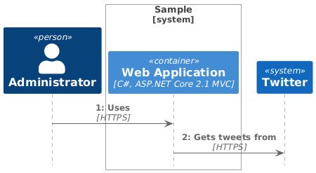 @startuml !include https://raw.githubusercontent.com/plantuml-stdlib/C4-PlantUML/master/C4_Sequence.puml SHOW_INDEX() Person(admin, "Administrator") System_Boundary(c1, 'Sample') Container(web_app, "Web Application", "C#, ASP.NET Core 2.1 MVC", "Allows users to compare multiple Twitter timelines") ' in a sequence diagram Boundary_End() has to be used instead of { } Boundary_End() System(twitter, "Twitter") Rel(admin, web_app, "Uses", "HTTPS") Rel(web_app, twitter, "Gets tweets from", "HTTPS") @enduml