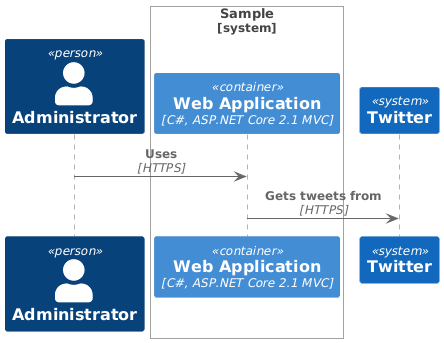 @startuml !include https://raw.githubusercontent.com/plantuml-stdlib/C4-PlantUML/master/C4_Sequence.puml SHOW_FOOT_BOXES() Person(admin, "Administrator") System_Boundary(c1, 'Sample') Container(web_app, "Web Application", "C#, ASP.NET Core 2.1 MVC", "Allows users to compare multiple Twitter timelines") ' in a sequence diagram Boundary_End() has to be used instead of { } Boundary_End() System(twitter, "Twitter") Rel(admin, web_app, "Uses", "HTTPS") Rel(web_app, twitter, "Gets tweets from", "HTTPS") @enduml
