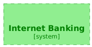 @startuml !include https://raw.githubusercontent.com/plantuml-stdlib/C4-PlantUML/master/C4_Container.puml AddBoundaryTag("v1", $bgColor="lightgreen", $fontColor="green", $borderColor="green") System_Boundary(c1, "Internet Banking", $tags="v1") { } @enduml