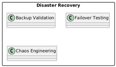 @startuml skinparam packageStyle rectangle skinparam linetype ortho package "Disaster Recovery" { class "Backup Validation" class "Failover Testing" class "Chaos Engineering" } @enduml