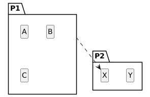 @startuml skinparam style strictuml hide empty members package P1 { class A class B class C } package P2 { class X class Y } ' link from pacage to class P1 ..> X @enduml