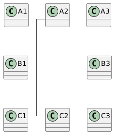 @startuml skinparam linetype ortho A1 -r[hidden]- A2 A2 -r[hidden]- A3 B1 -r[hidden]- B2 B2 -r[hidden]- B3 C1 -r[hidden]- C2 C2 -r[hidden]- C3 A1 -d[hidden]- B1 B1 -d[hidden]- C1 A2 -d[hidden]- B2 B2 -d[hidden]- C2 A3 -d[hidden]- B3 B3 -d[hidden]- C3 Hide B2 A2 -d[norank]- C2 @enduml