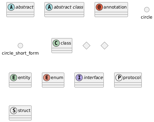 @startuml abstract abstract abstract class "abstract class" annotation annotation circle circle () circle_short_form class class diamond diamond <> diamond_short_form entity entity enum enum interface interface protocol protocol struct struct @enduml