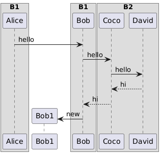 @startuml box B1 participant Alice order 10 participant Bob order 20 end box box B2 participant Coco order 30 participant David order 40 end box Alice -> Bob: hello Bob -> Coco: hello Coco -> David : hello return hi Coco -->Bob:hi create Bob1 order 19 Bob->Bob1:new @enduml