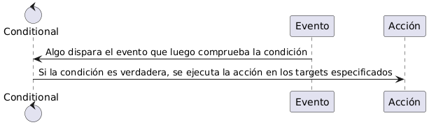 @startuml control Conditional as Cond participant Evento as Event participant Acción as Action Event -> Cond : Algo dispara el evento que luego comprueba la condición Cond -> Action : Si la condición es verdadera, se ejecuta la acción en los targets especificados @enduml